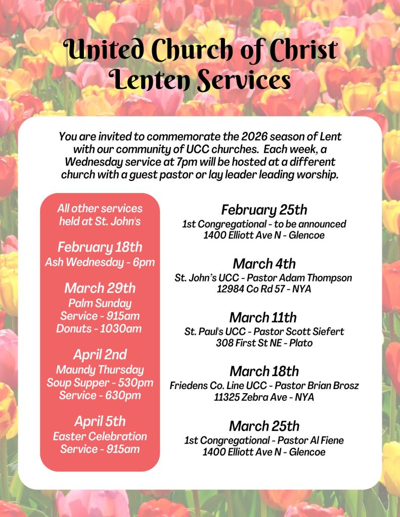 February 13, 2026stjohnsuccbongards UCC Community Lenten Season Services for 2026 Share this: Email a link to a friend (Opens in new window) Email Share on Facebook (Opens in new window) Facebook Share on X (Opens in new window) X